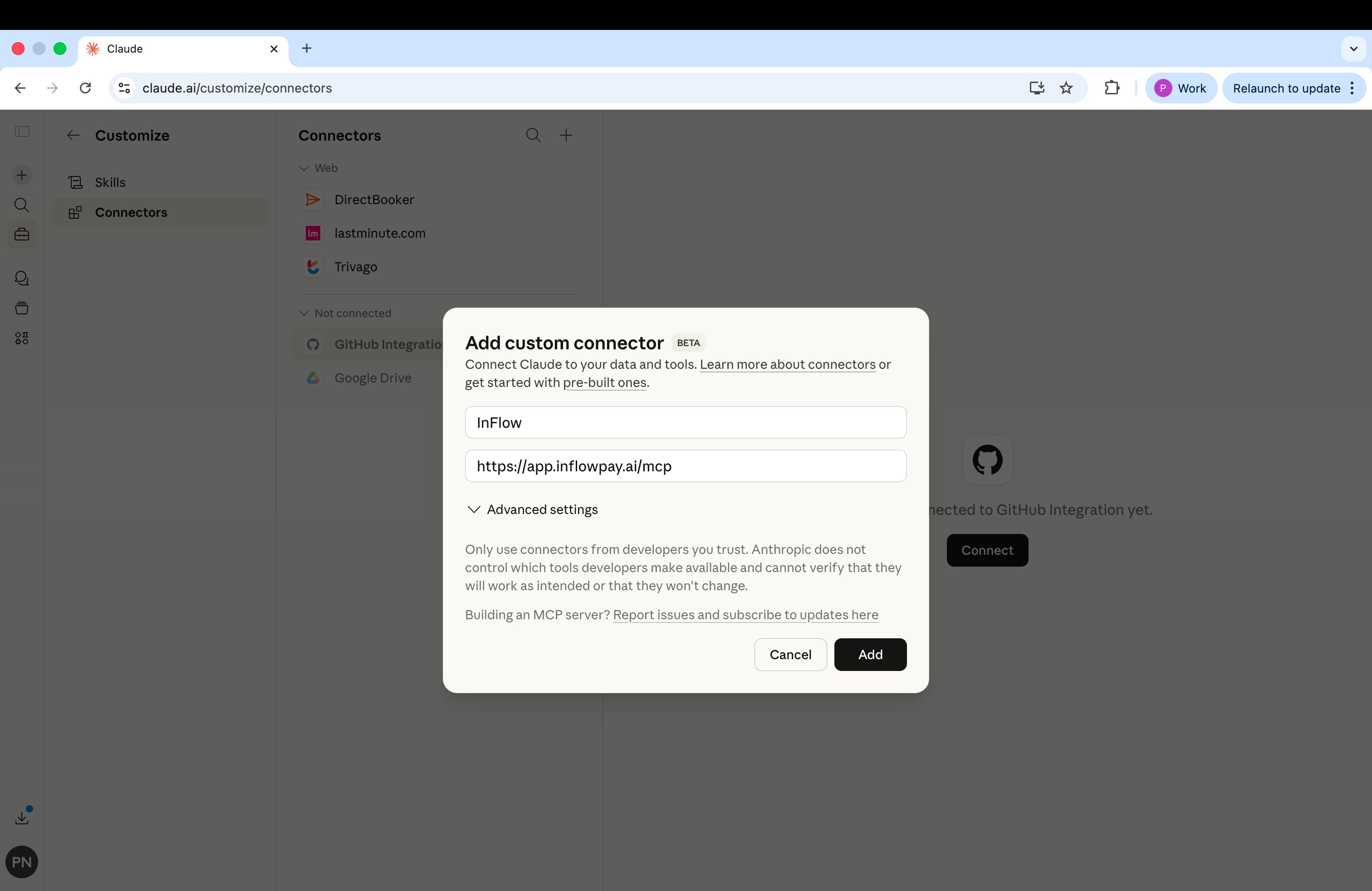 - Option 2: Add InFlow manually by following instructions on our GitHub (github.com/inflowpayai/inflow-mcp)